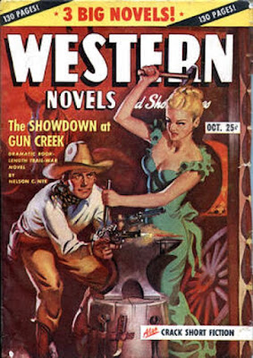 There's almost enough happening on this cover that it reminds me of Norman Saunders' work, but it's not a Saunders cover. Even so, I like it quite a bit. No idea who did the art. Inside this issue of WESTERN NOVELS AND SHORT STORIES are stories by some good pulpsters, including Giles A. Lutz, Ray Gaulden, Nelson C. Nye, John H. Latham, and little-known Harry E. Baker, who published only a few stories. I can't say that any of those authors are actual favorites of mine, but I'll bet it's an entertaining issue anyway.